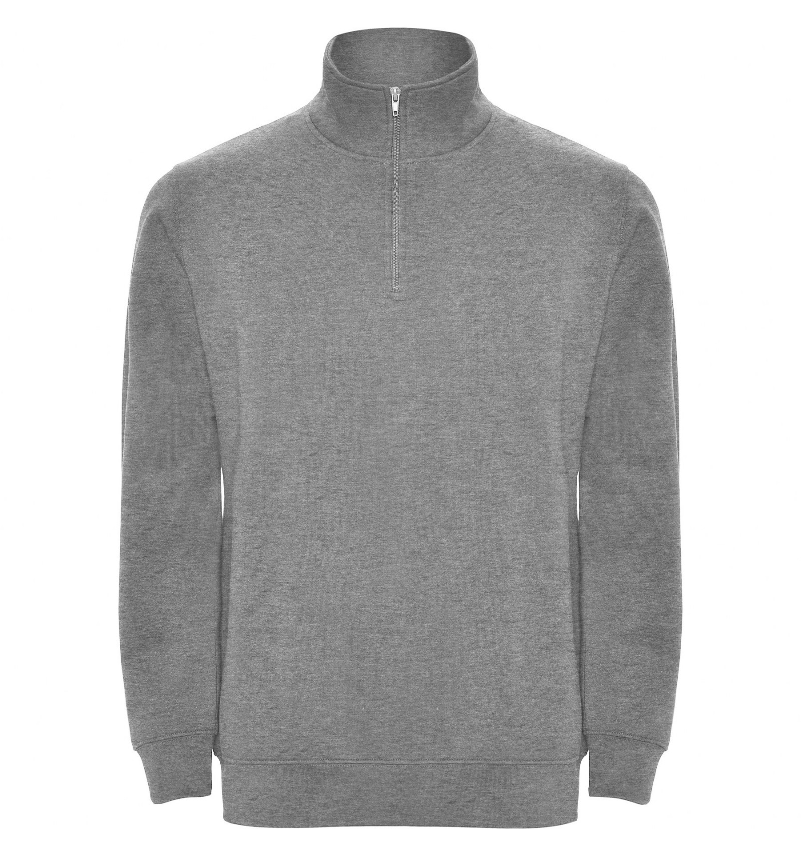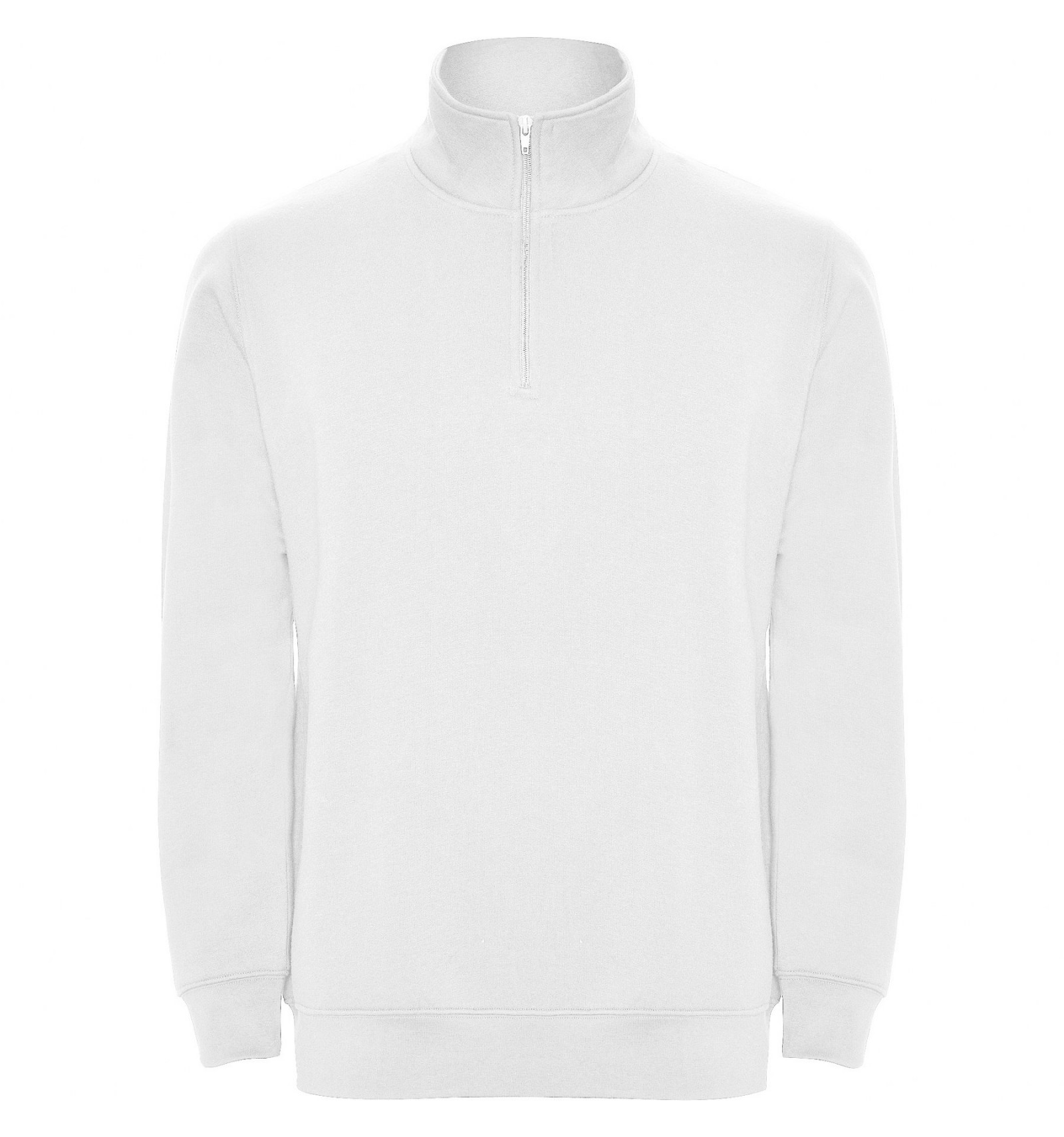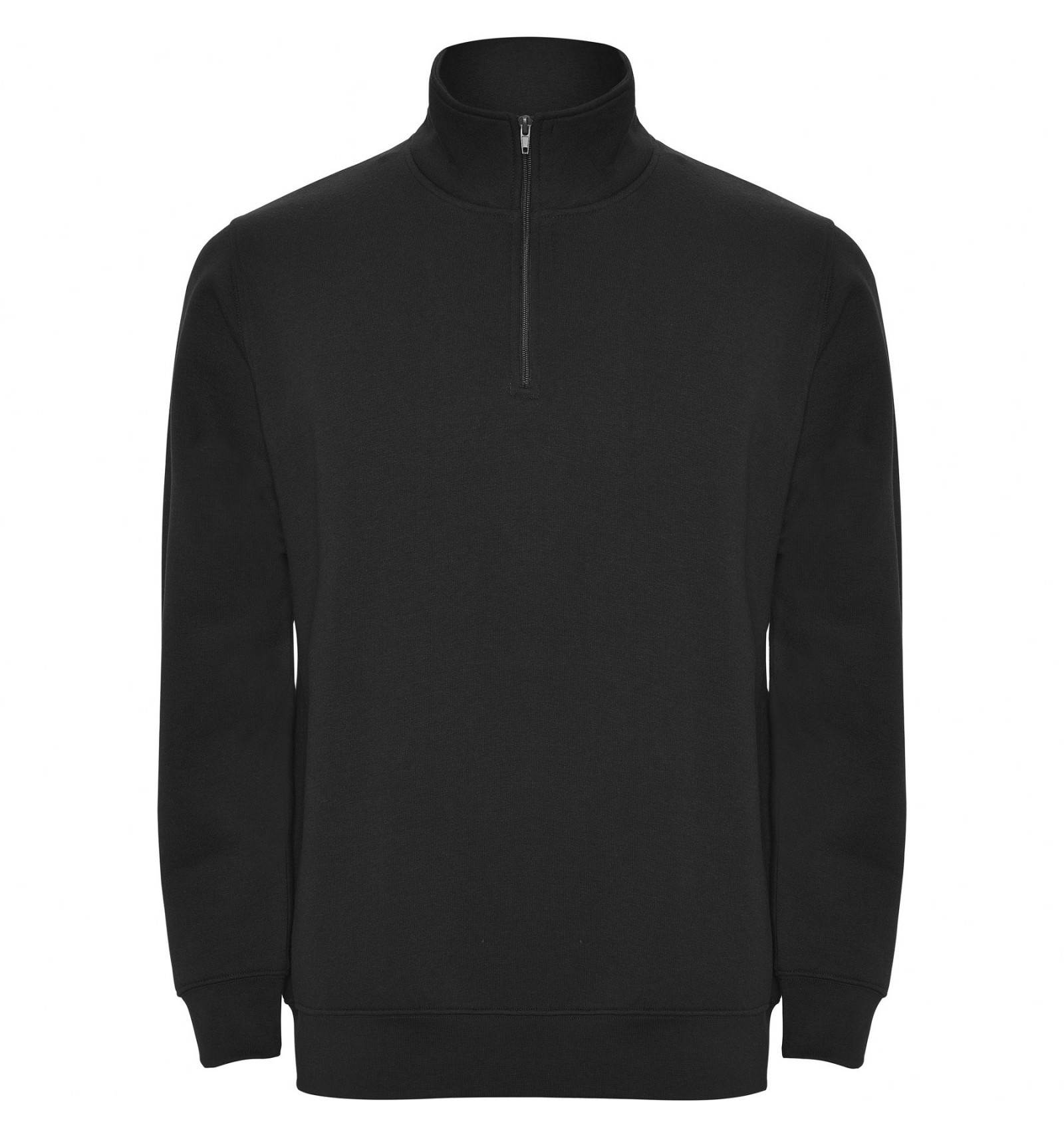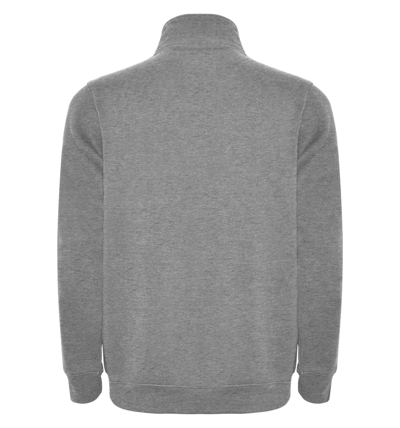 Hanorac cu fermoar la gât de aceeași culoare și guler înalt. Interior guler de aceeași culoare. Bandă întărită pentru acoperirea cusăturii pe interior la guler. Punct în canalé 1x1 la manșete și în talie.