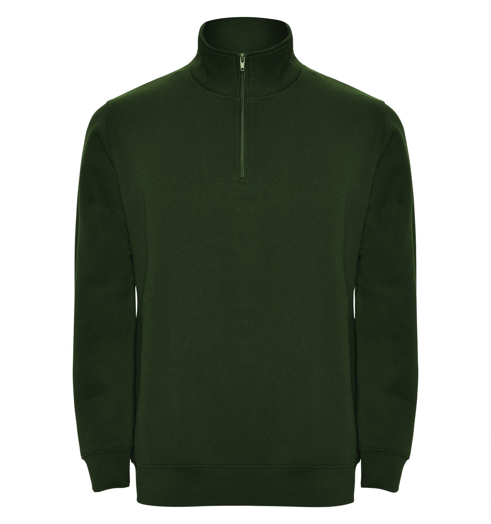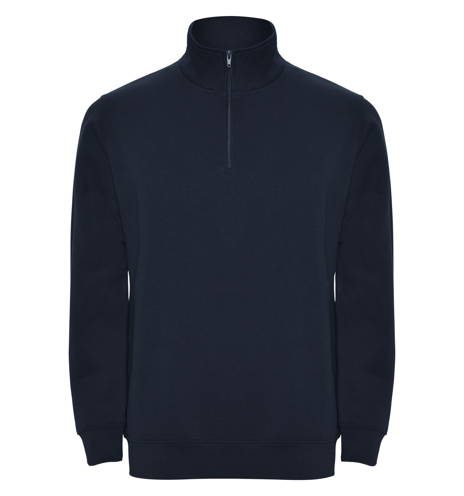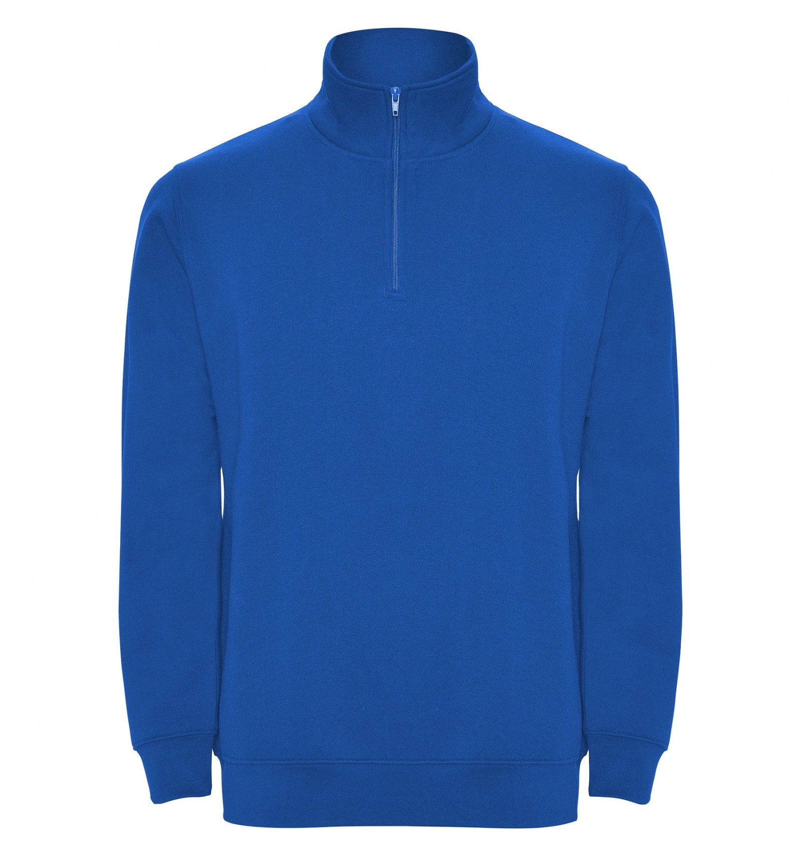 Hanorac cu fermoar la gât de aceeași culoare și guler înalt. Interior guler de aceeași culoare. Bandă întărită pentru acoperirea cusăturii pe interior la guler. Punct în canalé 1x1 la manșete și în talie.