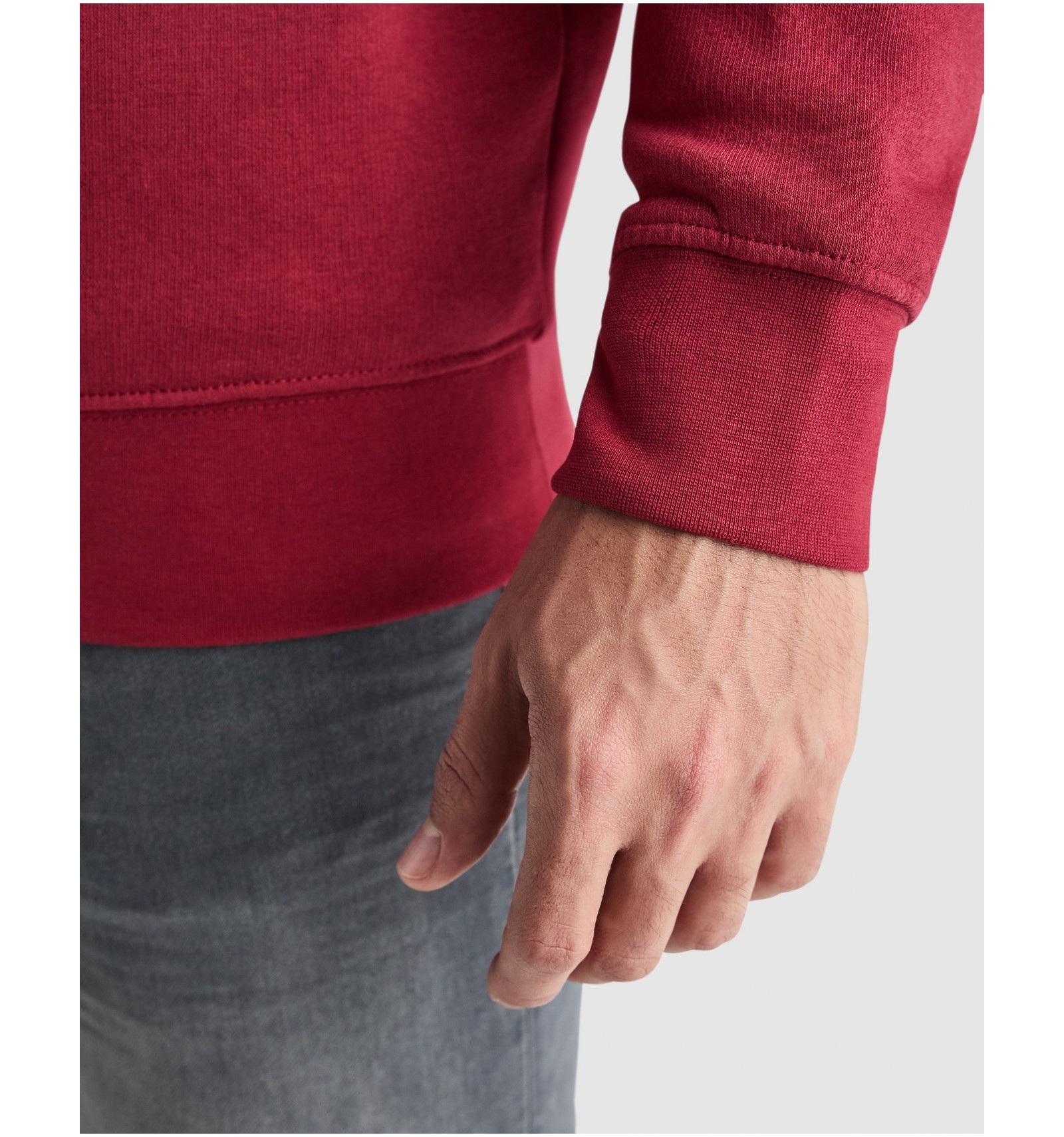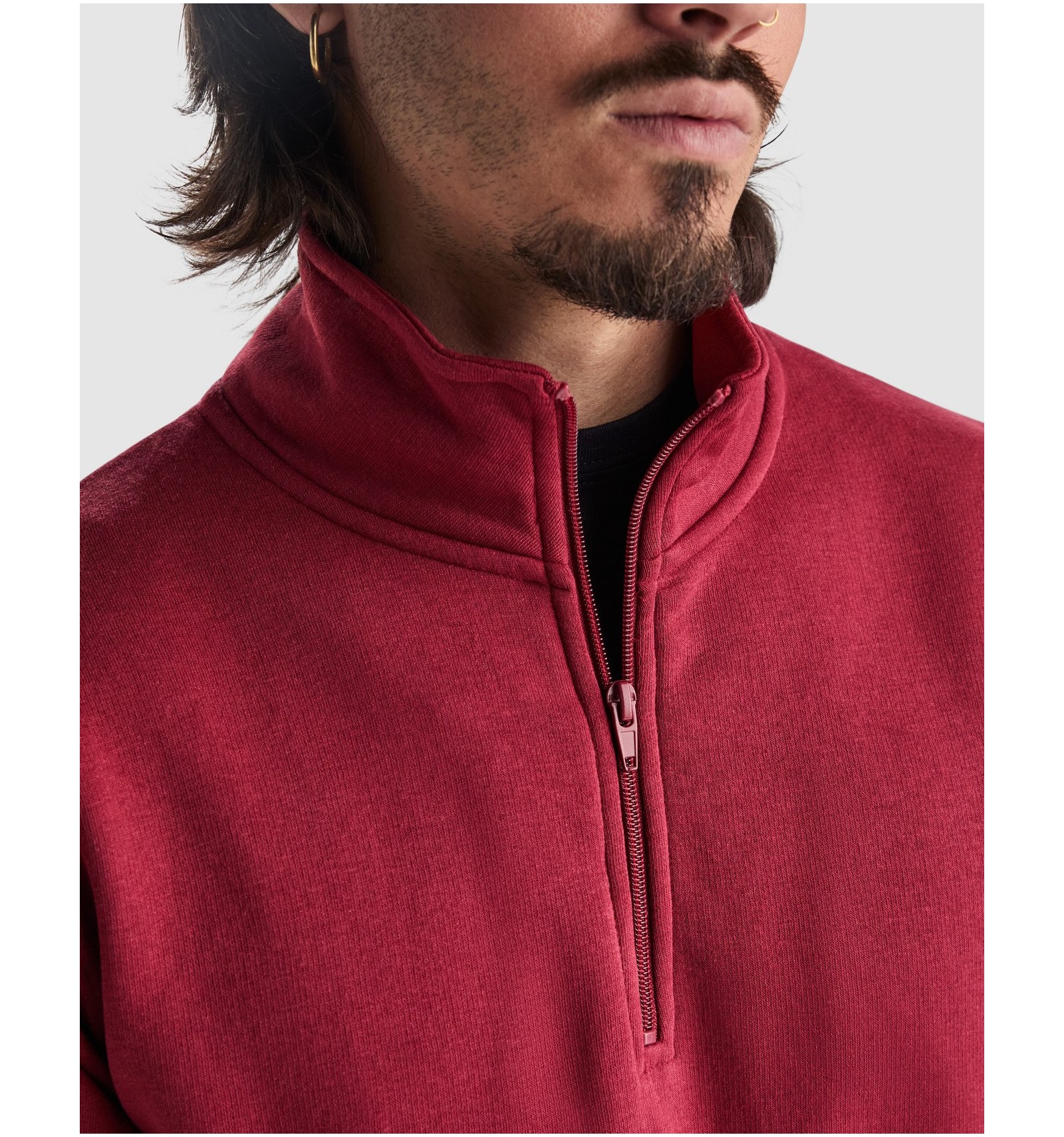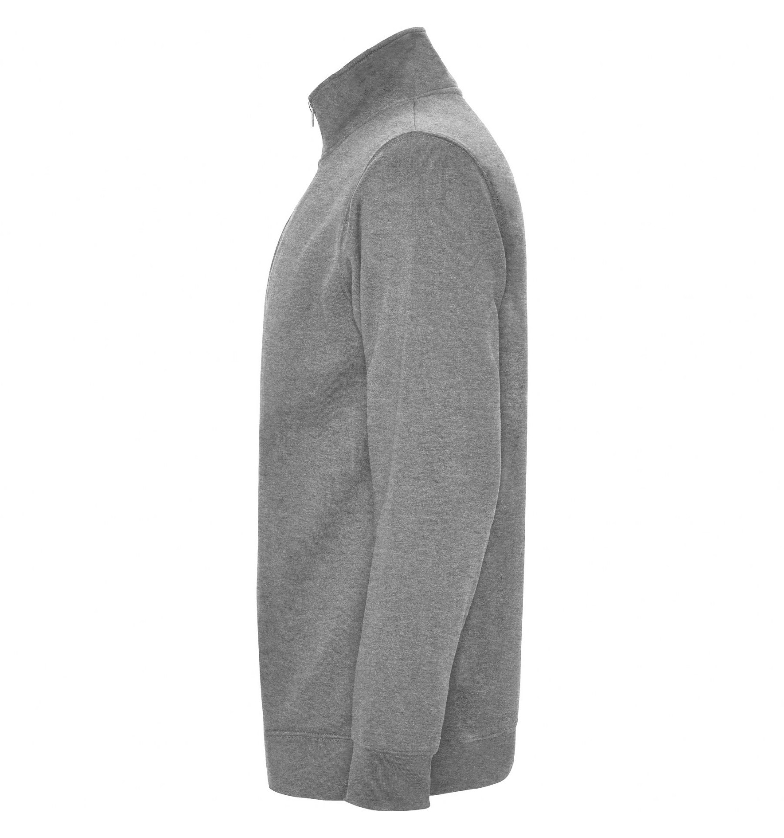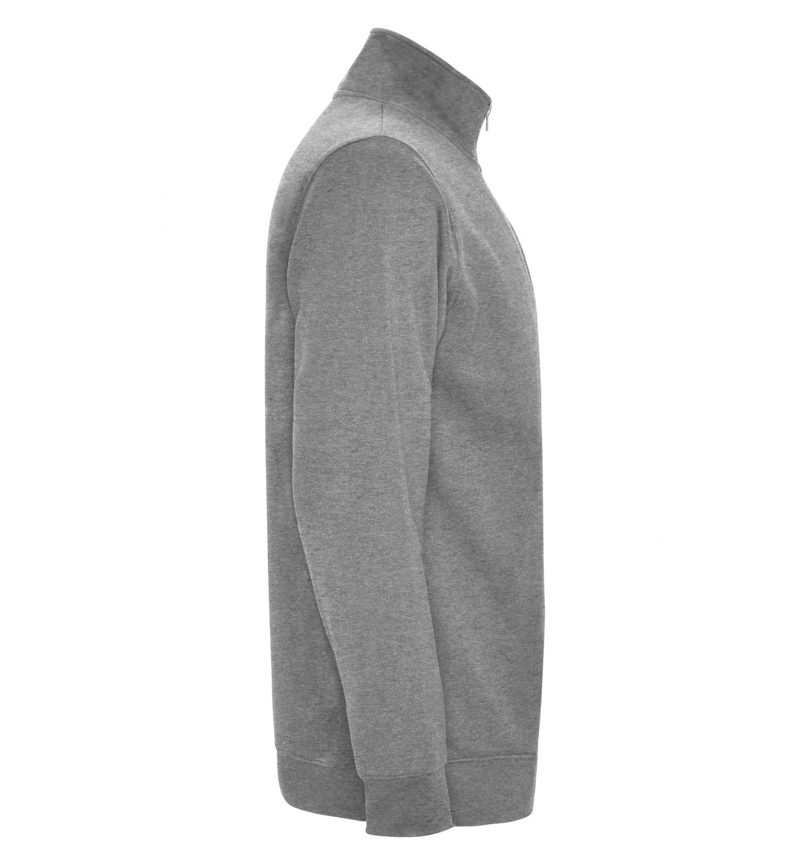 Hanorac cu fermoar la gât de aceeași culoare și guler înalt. Interior guler de aceeași culoare. Bandă întărită pentru acoperirea cusăturii pe interior la guler. Punct în canalé 1x1 la manșete și în talie.