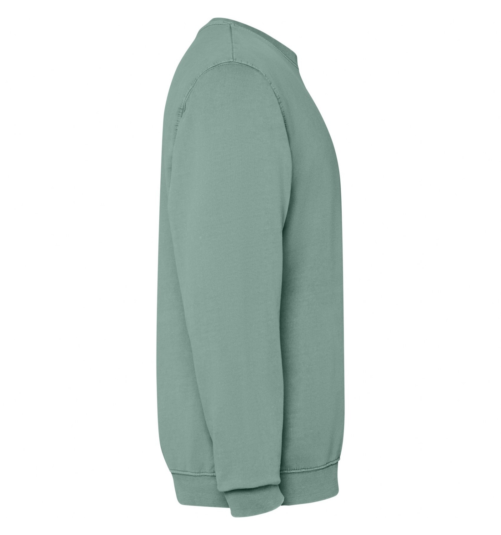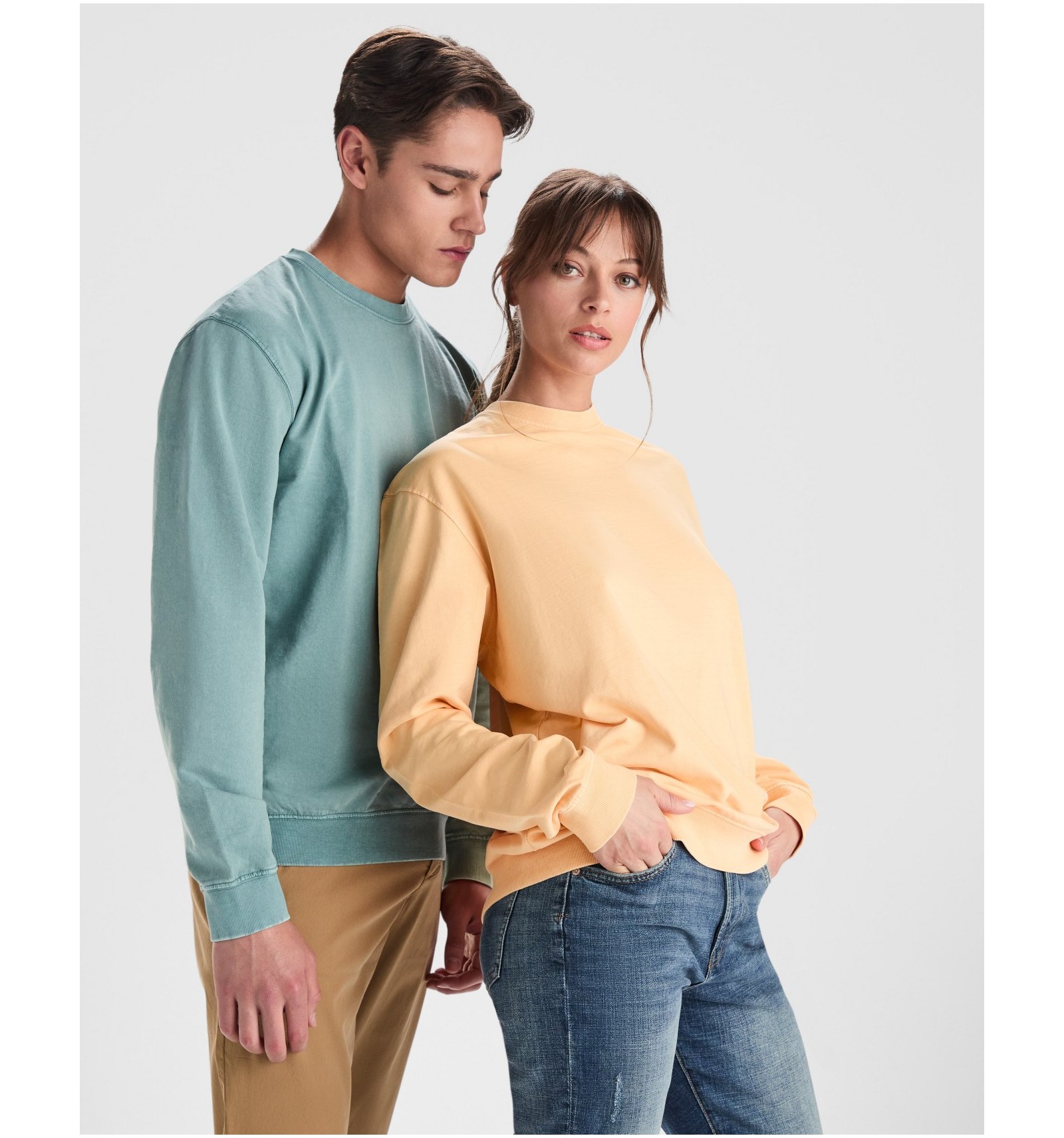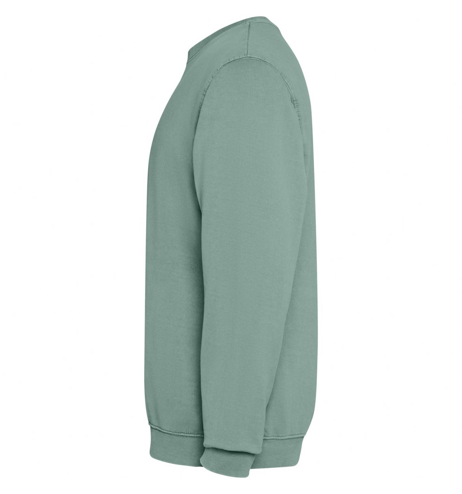 Hanorac unisex cu guler rotund din bumbac spălat nevătuit. Guler, manșete și talie din material reiat 2x1 cu elastan.
